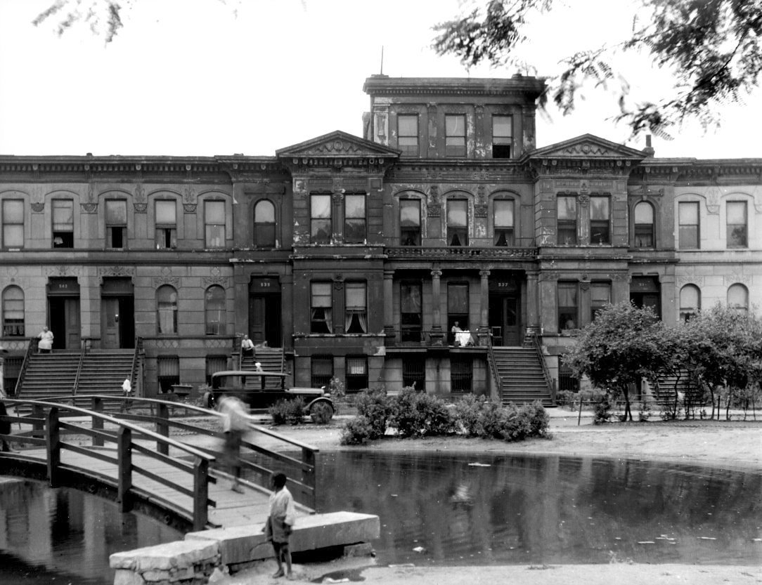 The buildings would have been fairly substantial; probably brick, as the area had been built as fairly upscale housing. When the area became African-American, about the time Morton lived there; the buildings were owned by absentee landlords who divided the buildings into small rental dwellings, collected as much rent as they could and did little or nothing to maintain the buildings. The area went into a sharp decline and it was leveled during the late 1930s when the WPA constructed a large public housing project on the site. The street (Aldine Square) ceased to exist at that time.