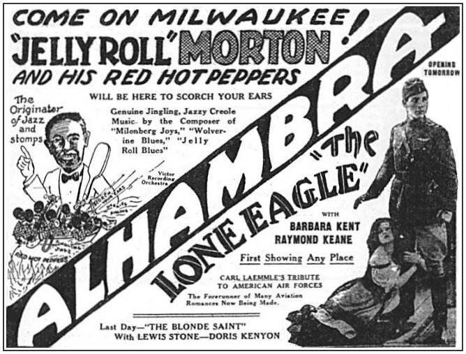 Alhambra Theater Stage 334 West Wisconsin Avenue, Milwaukee, Wisconsin The Milwaukee Journal printed a stunning pictorial advertisement on Friday, 19th August 1927, page 19, for “Jelly Roll” Morton and his Red Hot Peppers, who were booked by the Music Corporation of America for a one week engagement at the prestigious Alhambra Theater.