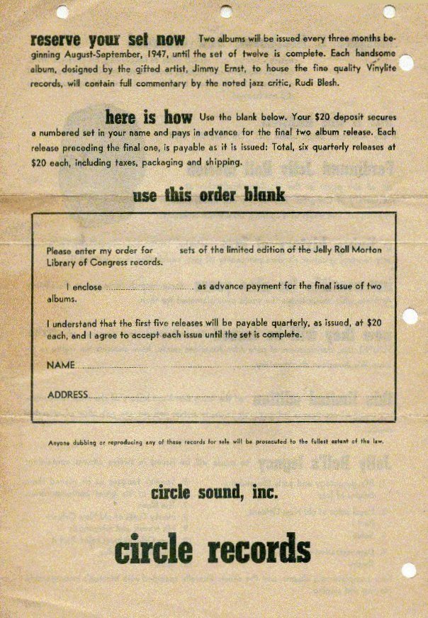1947 Circle Records order form for the limited edition Jelly Roll Morton Library of Congress records