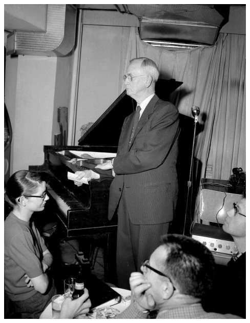 Portrait photograph of Roy J. Carew lecturing on Jelly Roll Morton