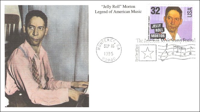 First Day Cover issued 16th September 1995 in Monterey, CA. The hand-coloured portrait of Jelly Roll above is from a series of photographs taken by Otto F. Hess during Morton’s second Bluebird recording session on 28th September 1939 at the RCA Manufacturing Company, Inc., studio #3, 155 E. 24th Street, New York City, N.Y. courtesy of Millie Gaddini