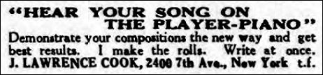 In 1949 J. Lawrence Cook was contracted to make music rolls, which would appear on 78-r.p.m. Abbey Records. An exploratory list, compiled by Mike Montgomery, appears in Volume 5 of The Billings Rollography. [BR]