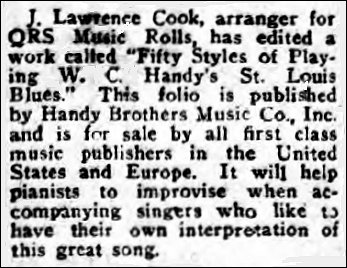 In 1934 Handy Brothers Music Co., Inc. published a 17-page folio of 50 Styles of Playing W. C. Handy’s SAINT LOUIS BLUES Jazz Breaks for Piano, arranged by J. Lawrence Cook, Q.R.S. Player Roll Artist and Earle L. Sparks. Price $1.00. [Left Cover]