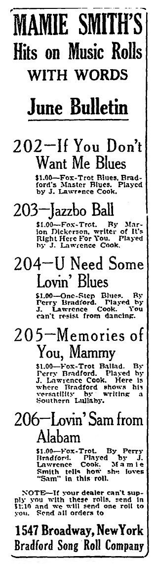 Possibly his first free-lance commercial assignment was for the “Bradford Song Roll Company.” Songwriter Perry Bradford, an associate of Jelly Roll Morton, ran the company, which was located at 1547 Broadway, New York. A monthly bulletin for June 1921, featuring 5 hits of the famous blues singer Mamie Smith, was published in The Chicago Defender, dated Saturday, 4th June 1921, page 7, column 6. [AW 1] |
