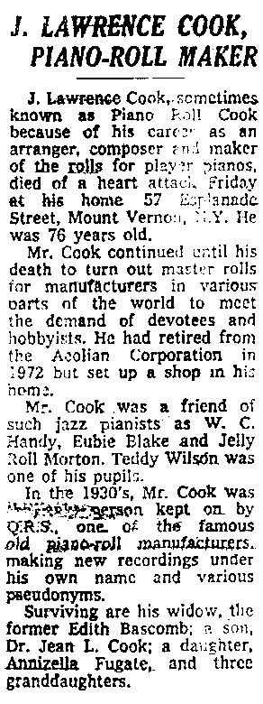 J. LAWRENCE COOK, J. Lawrence Cook, sometimes known as Piano Roll Cook because of his career as an arranger, composer and maker of the rolls for player pianos, died of a heart attack Friday at his home, 57 Esplanade Street, Mount Vernon, N.Y. He was 76 years old. |