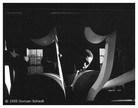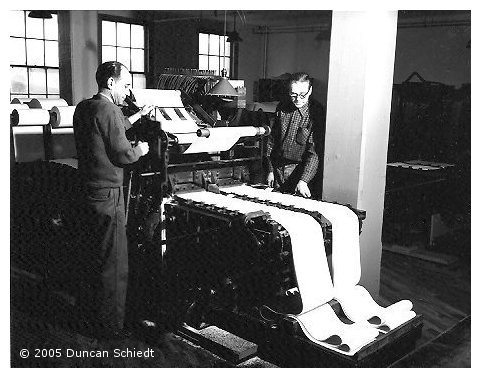 L. Checking the paper that feeds into the twin production perforator. [AR 1] © 2005 Duncan Schiedt |