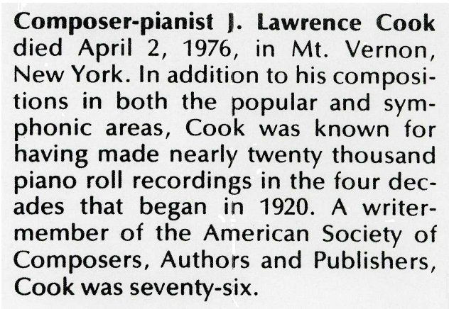 Composer-pianist J. Lawrence Cook died April 2, 1976, in Mt. Vernon, New York. In addition to his compositions in both the popular and symphonic areas, Cook was known for having made nearly twenty thousand piano roll recordings in the four decades that began in 1920. A writer-member of the American Society of Composers, Authors and Publishers, Cook was seventy-six. |