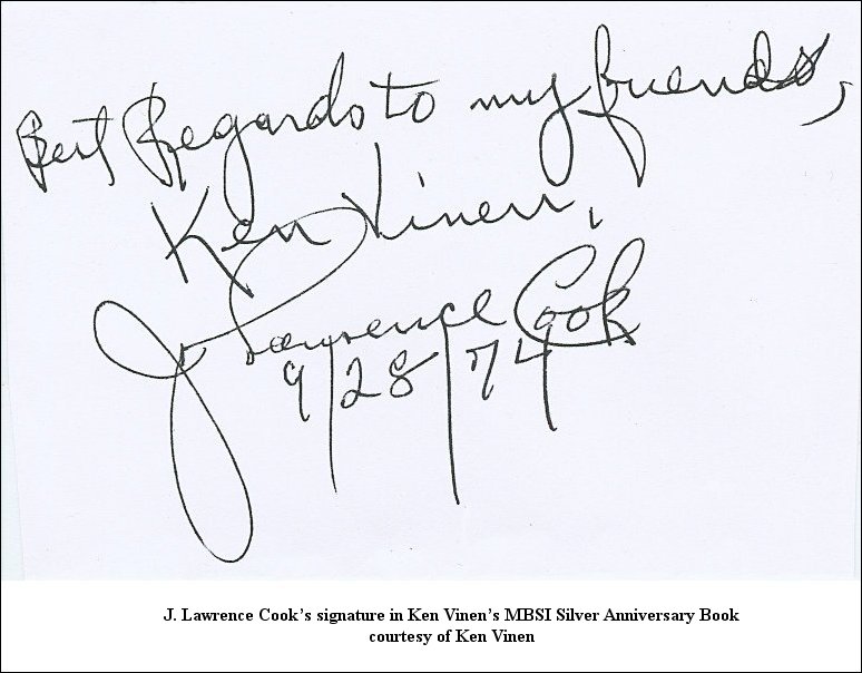 Prof. Alan Wallace sends details of the following items of J. Lawrence Cook memorabilia from his collection. |