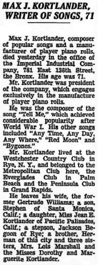 MAX J. KORTLANDER, Max J. Kortlander, composer of popular songs and a manufacturer of piano rolls, died yesterday in the office of the Imperial Industrial Company, 781 East 136th Street, the Bronx. His age was 71. |
