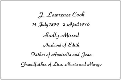 J. Lawrence Cook died on Friday, 2nd April 1976. His daughter Annizella sent me the following Memorial Cards. I feel very honoured to have known him and to have shared a common interest of arranging music rolls. In my estimation he made a tremendous contribution to American music. |