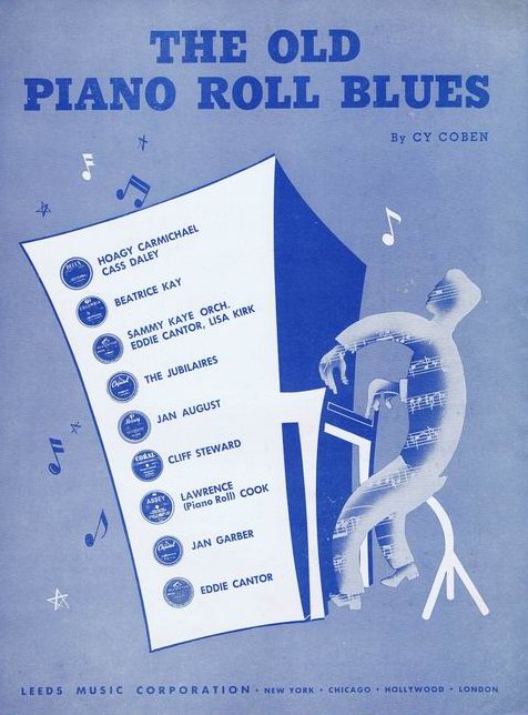 From his vast collection of sheet music memorabilia, ‘Perfessor’ Bill Edwards sends this 1949 sheet music cover of THE OLD PIANO ROLL BLUES. Lawrence (Piano Roll) Cook is featured on the cover, along with a number of other notable artists. |